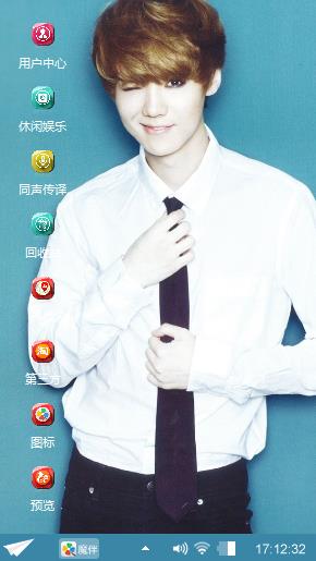 清新蓝的背景下,是人气偶像小鹿晗,鹿晗卖萌地眨巴着眼睛,搞笑的样子十分有趣。白色衬衫和黑色休闲裤好像是为他的量身打造,白衬衫尽显鹿晗的阳光帅气。桌面图标设计成五彩缤纷的样式,就像是跑男无穷尽的精彩。喜欢鹿晗的你,千万不要错过呦!